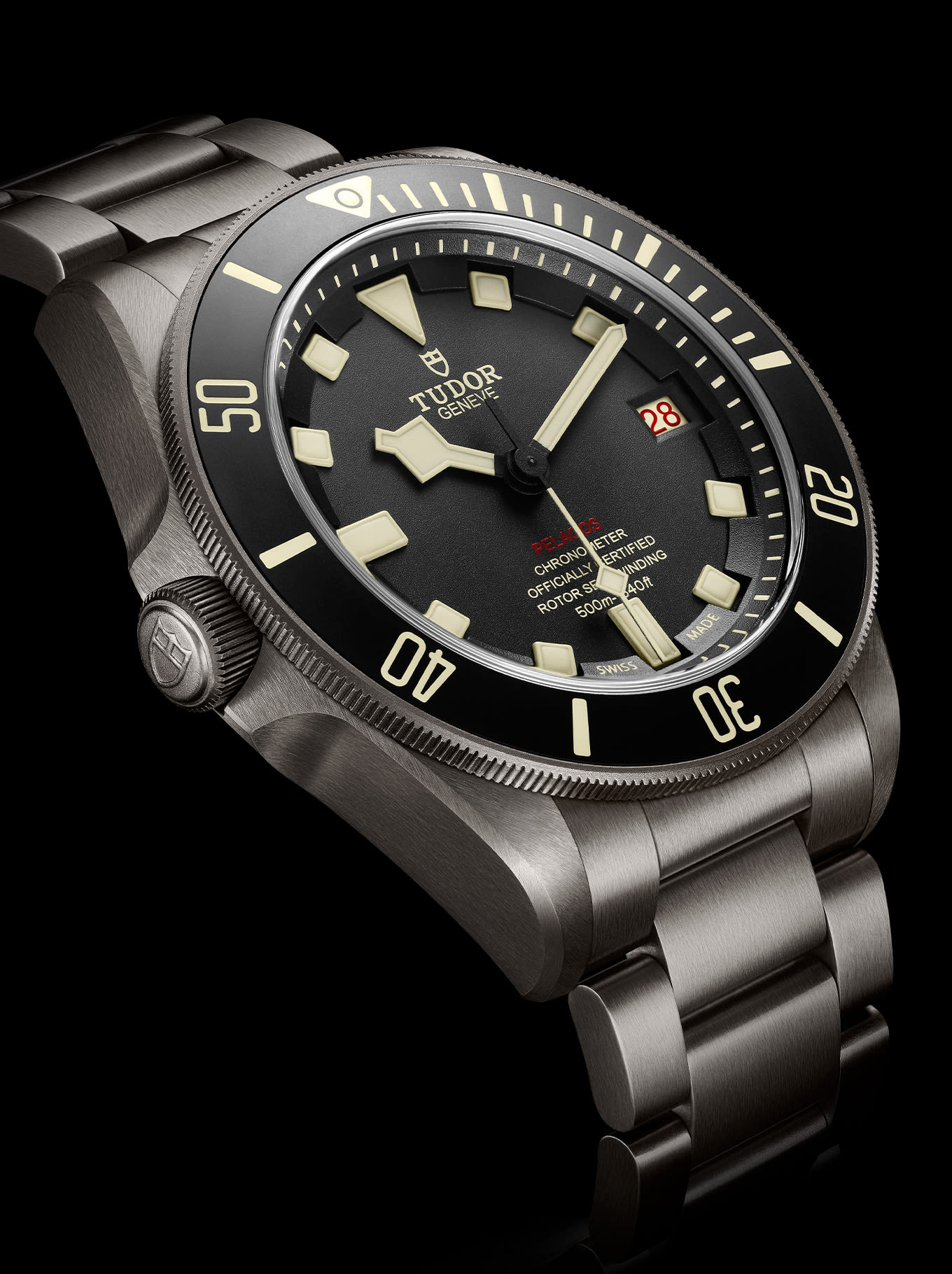 جُهز طراز بيلاغوس الجديد بمينا أُعيد صياغته بعلامات مضيئة باللون البيج واسم بيلاغوس "PELAGOS" باللون الأحمر عند موضع الساعة ٦.