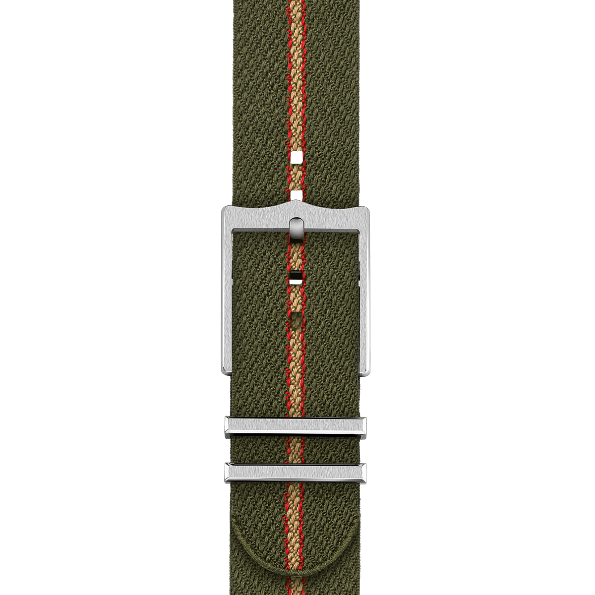 綠色織紋錶帶,飾以紅色及米色條紋,配帶扣